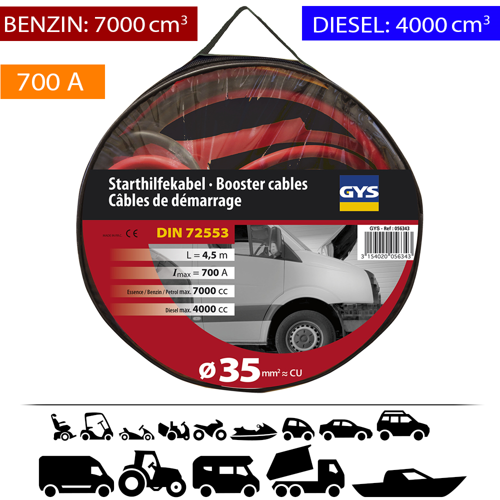 A GYS hosszú és ellenálló indítókábelt hordtáskával szállítjuk, így könnyen szállítható és praktikusan tárolható.